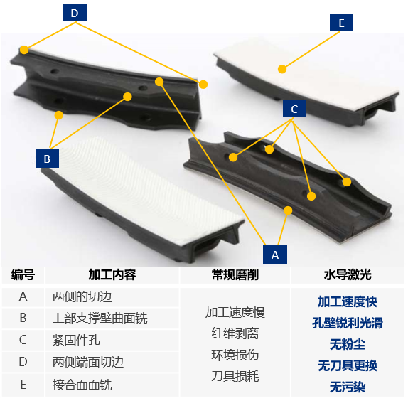 RJ505水導(dǎo)激光加工機床憑借其強大的激光能量和水冷卻特性,能夠有效避免過熱和氣孔等缺陷,提供更高的切割精度和加工質(zhì)量,從而顯著提升汽車制造業(yè)中復(fù)合材料零部件的生產(chǎn)效率和質(zhì)量。