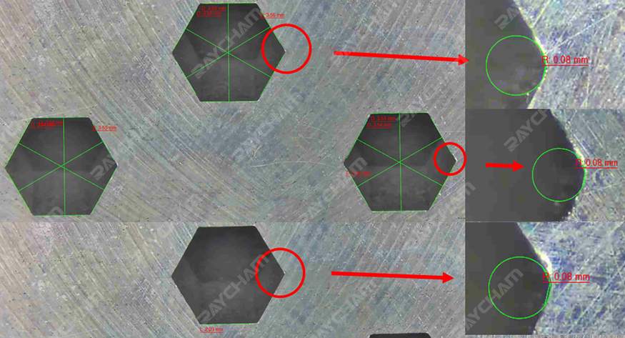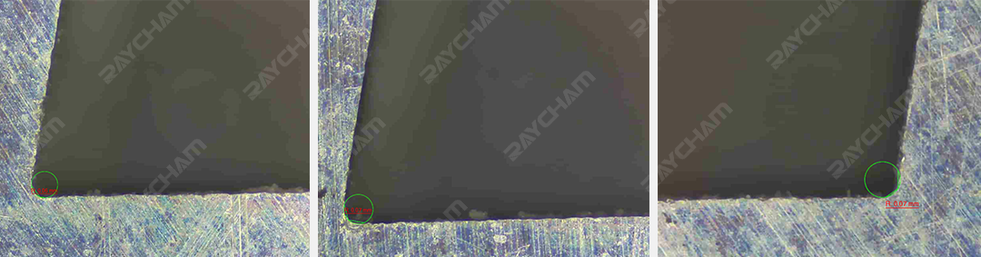 經(jīng)參數(shù)優(yōu)化,槽側(cè)壁表面粗糙度可以達(dá)到Ra1.2左右。相鄰面之間的過渡圓弧僅在0.06mm左右。切割表面無熱影響區(qū),重熔層可以保持在3μm以下。