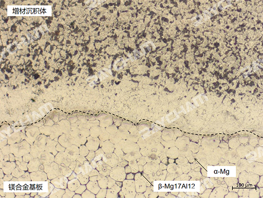 金相觀察結(jié)果:顯微組織為離異共晶組織,主要由固溶體α-Mg與晶間離異的共晶β-Mg17Al12相組成,呈不規(guī)則分布,主要在晶界附近。在電弧增材特殊的熱輸入影響下,析出的β-Mg17Al12相尺寸、分布與鑄態(tài)金屬不同,會(huì)有更加細(xì)小的α固溶體,同時(shí)晶界附近存在細(xì)小均勻分布的連續(xù)析出β相,產(chǎn)生彌散強(qiáng)化效果,從而提高力學(xué)性能。