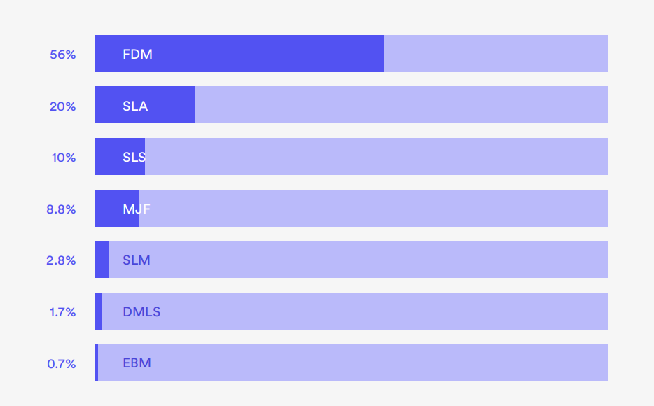 不出所料,F(xiàn)DM(熔融沉積成型)仍然是參與調(diào)查的人最常見的選擇,有56%的人表示這是他們最常用的增材制造方法。此外,后處理選項(xiàng)的進(jìn)步正在幫助推動(dòng)3D打印的采用。