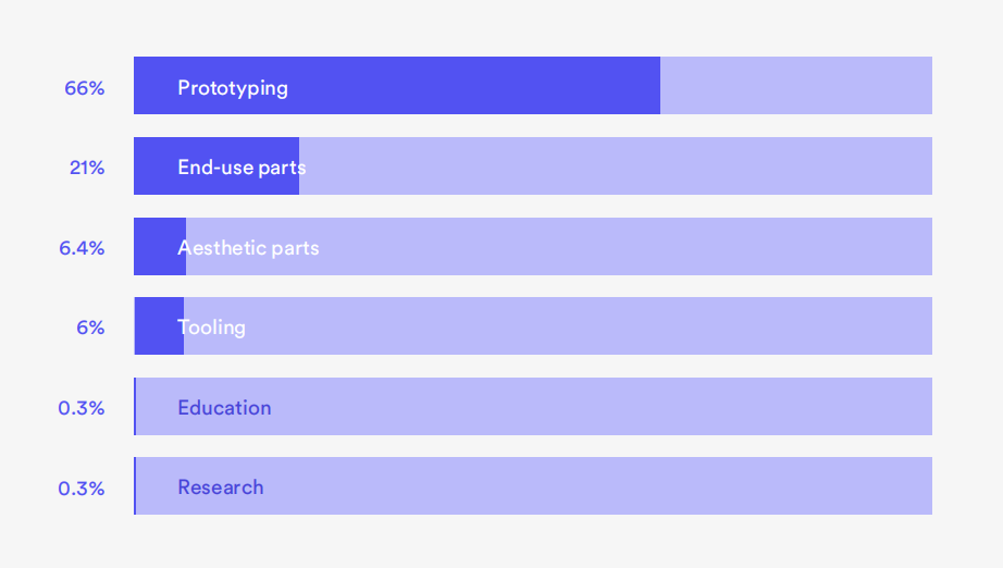 原型制作在全面生產(chǎn)之前開發(fā)樣品產(chǎn)品以評(píng)估設(shè)計(jì)和功能是3D打印的第一個(gè)真正用途,并且仍然占很大份額。66%的受訪者將其列為3D打印的主要用途。其他關(guān)鍵應(yīng)用包括加工、小批量生產(chǎn)、大規(guī)模定制和批量生產(chǎn)。